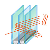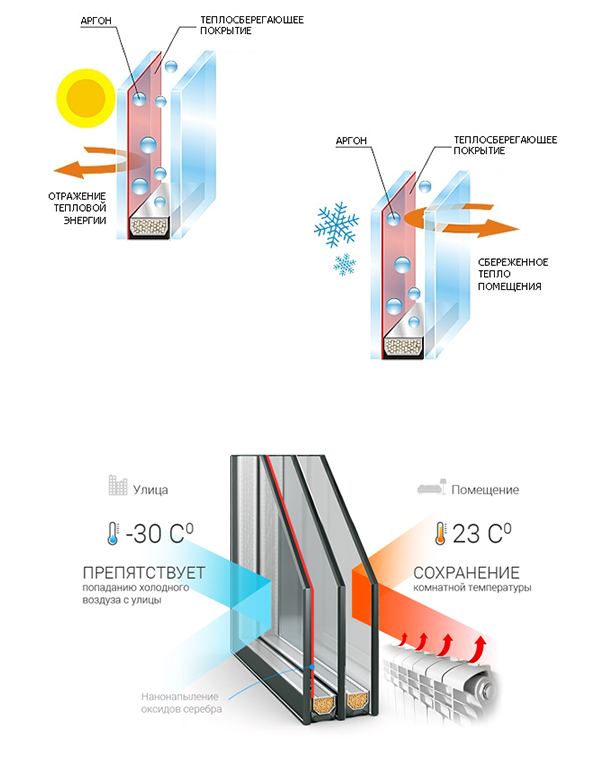 Энергосберегающий стеклопакет, помимо обычного стекла, включает в себя низкоэмисионноное стекло и действует по принципу теплового зеркала. Теплоотражающее покрытие находится внутри стеклопакета, что в свою очередь сохраняет его от механических воздействий.